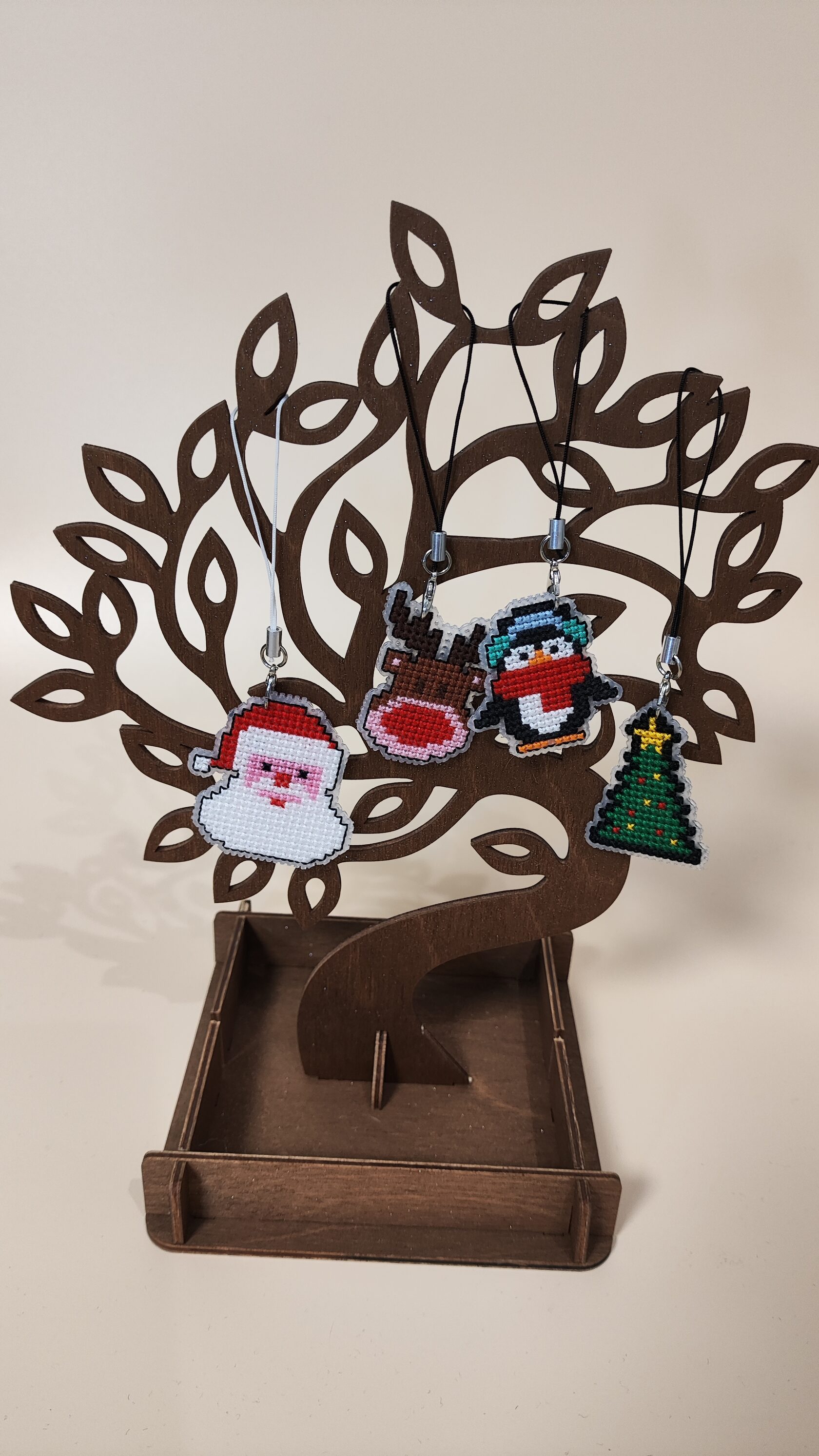 • Материалы: Натуральное дерево, экокожа, нити мулине. • Размер: Примерно 10х9 см. • Декор: Ручная вышивка. • Назначение: Елочное украшение, новогодний декор, сувенир.